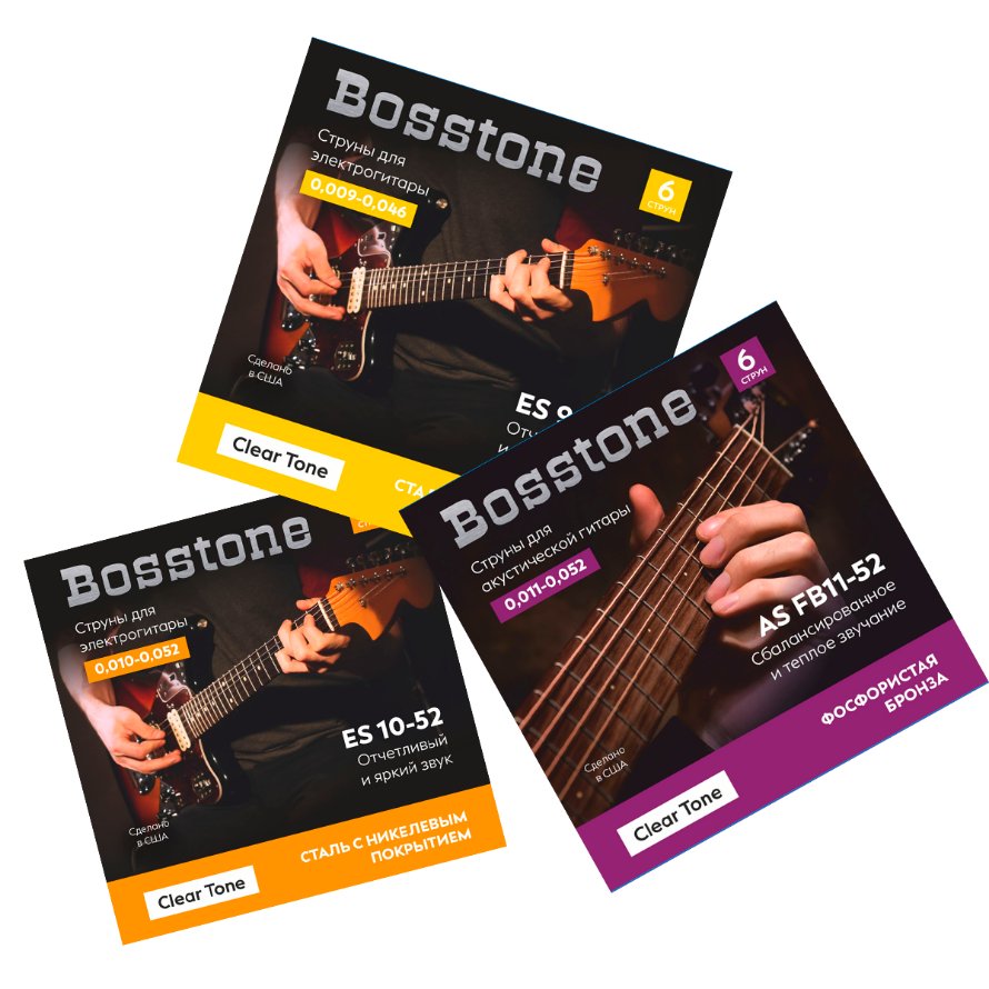 Bosstone предлагает большой выбор струн: наборы для электрогитары из стали с никелевым покрытием, струны для акустической гитары бронза и фосфор-бронза, струны для классической гитары нейлон.